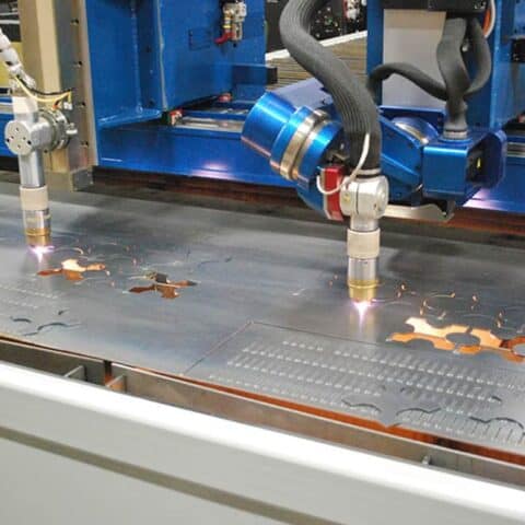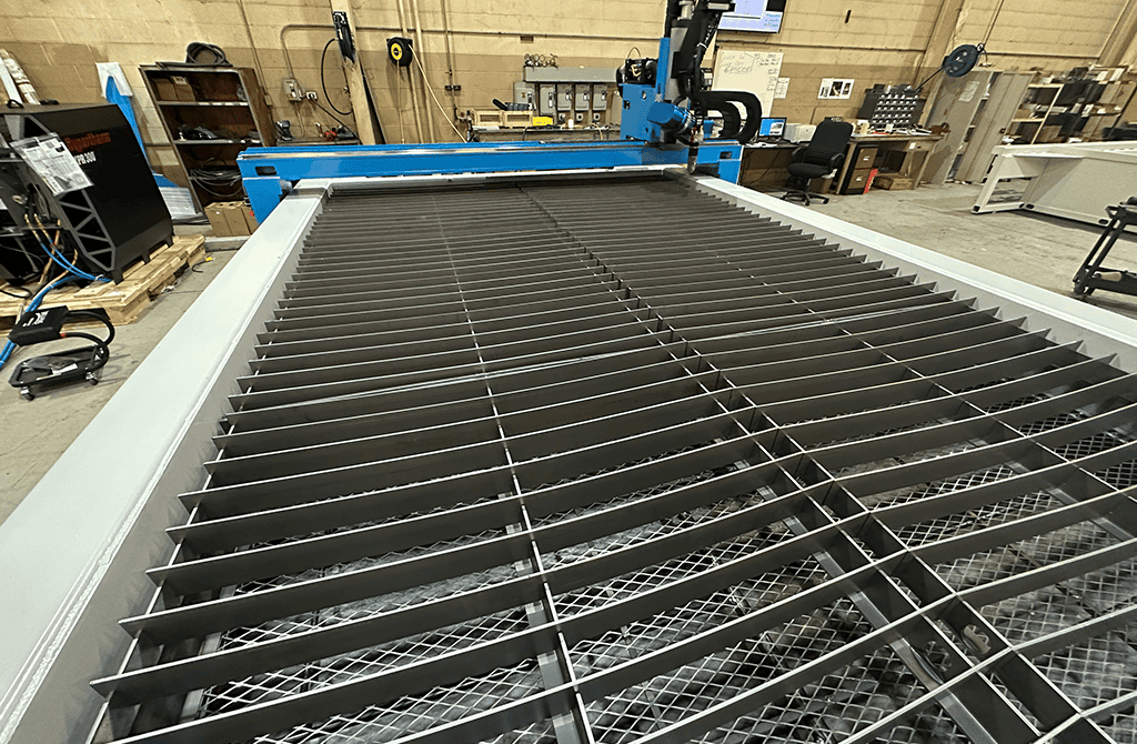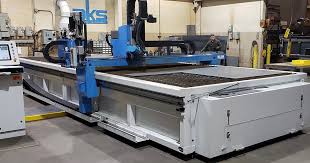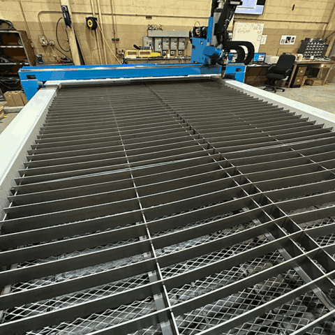 The AKS Plasma table with five-axis head can cut up to two-inch carbon-steel plate. The table also has an oxy-fuel torch head that can cut from 1/8” to 6 carbon-steel plate. This unit is equipped with a water vent-injection system, a patent-pending process featuring a vented N2 plasma gas and H2O shield gas for less angularity and squarer cut edges on stainless steel and aluminum.