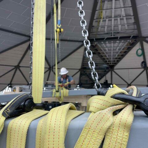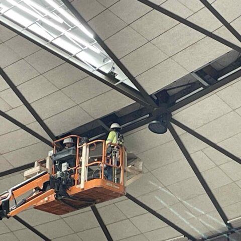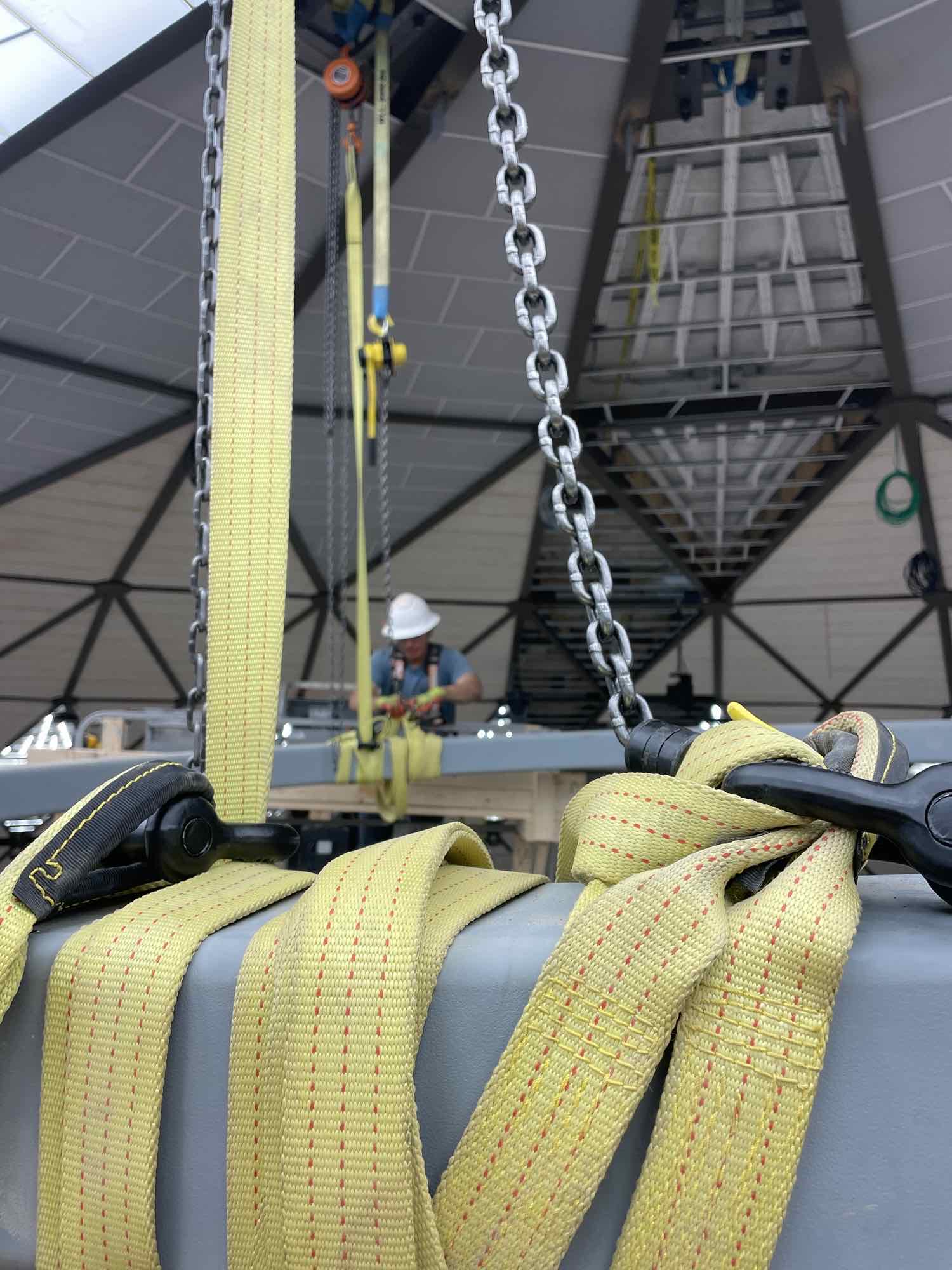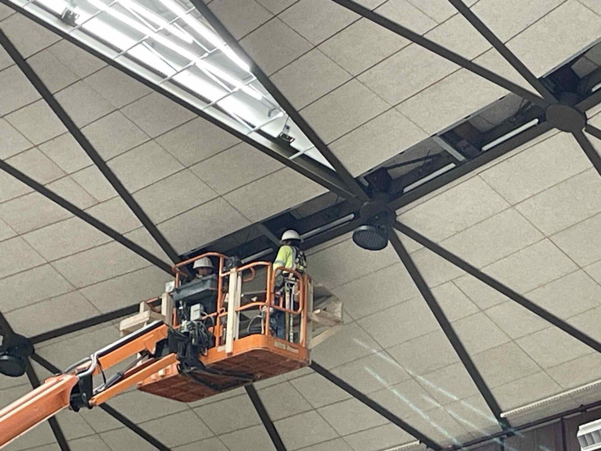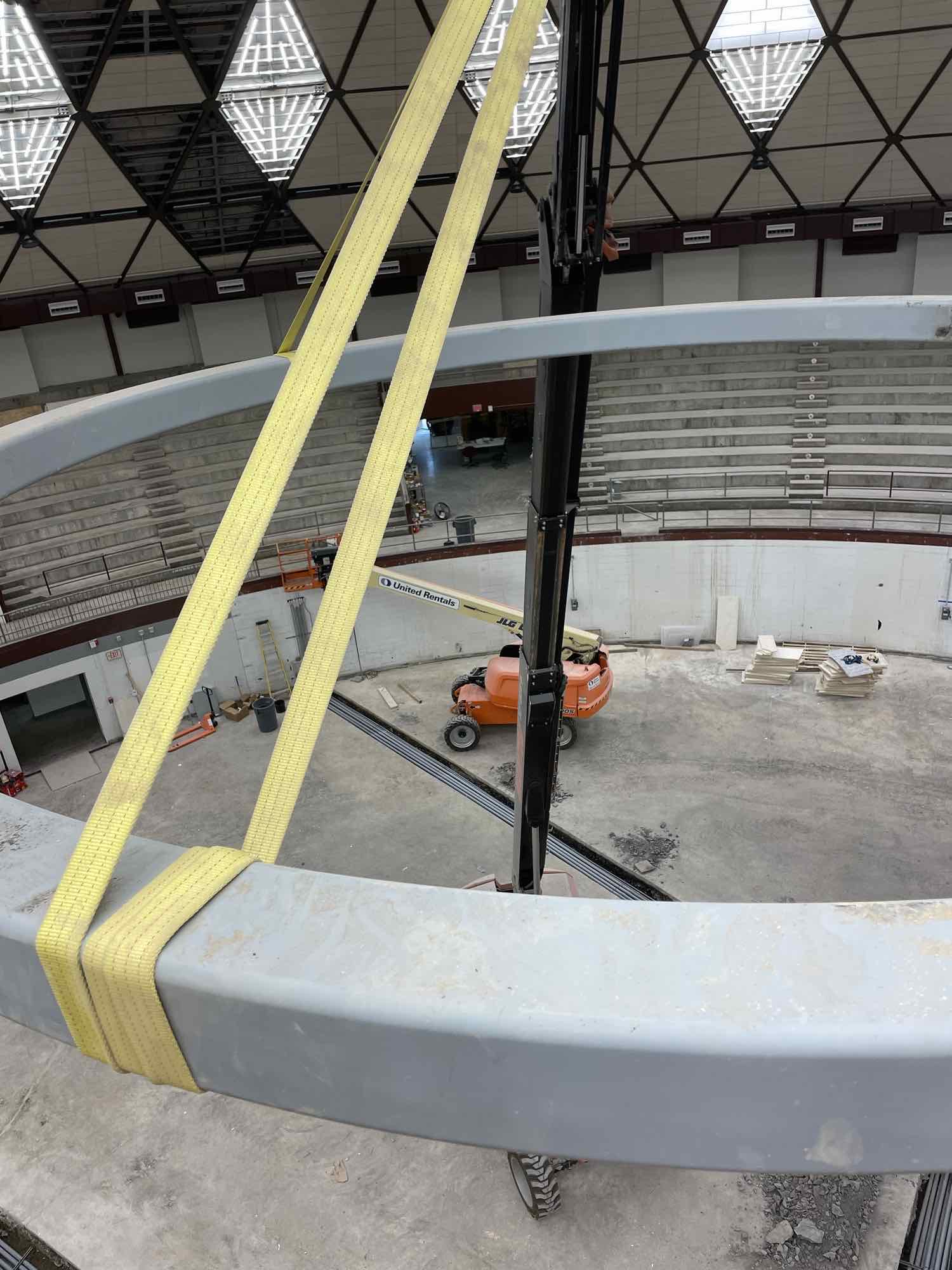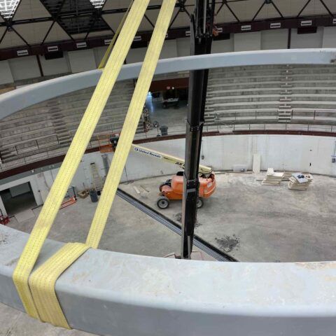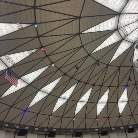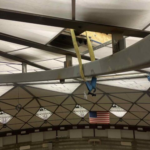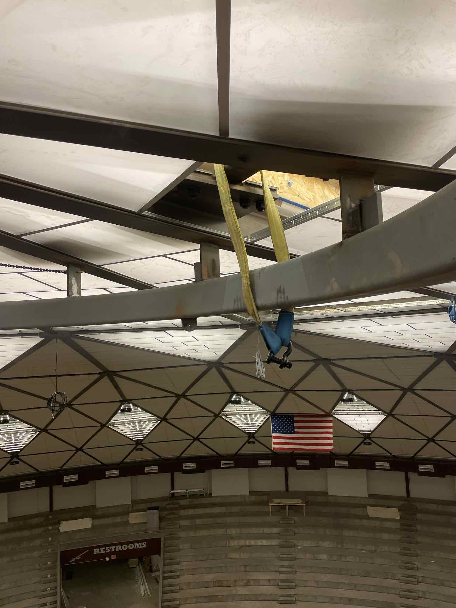 Dome Technology fabricated all components for the roof retrofit, including steel plates, beams, and pipe connections. The new steel beams were joined to the underside of the existing wood beams for stability and strength while preserving the ceiling’s unique star motif. Support for a new four-sided, centrally hung scoreboard also factored into the engineering plan. The team applied polyurethane foam and a two-part epoxy product to the roof exterior.