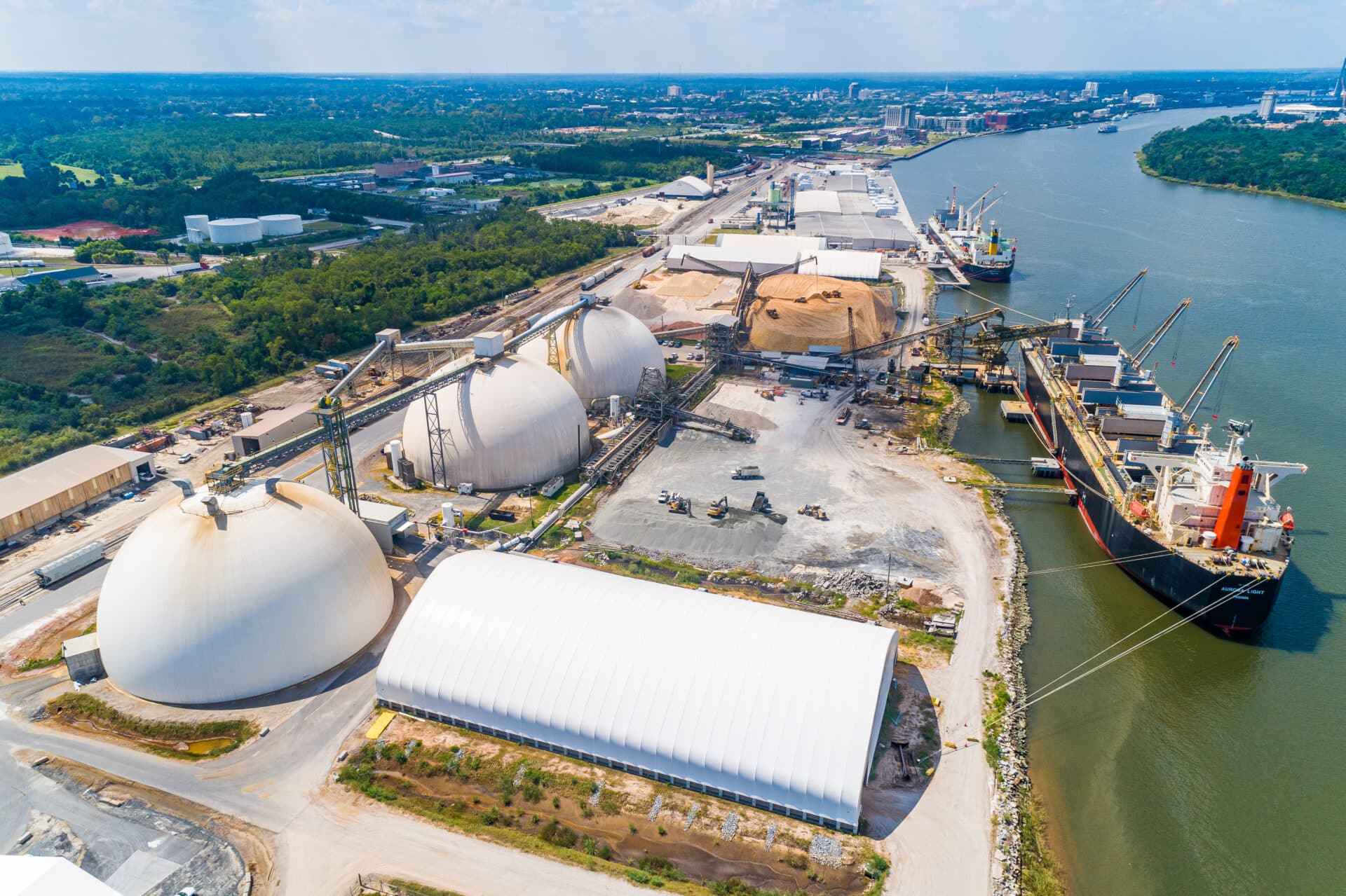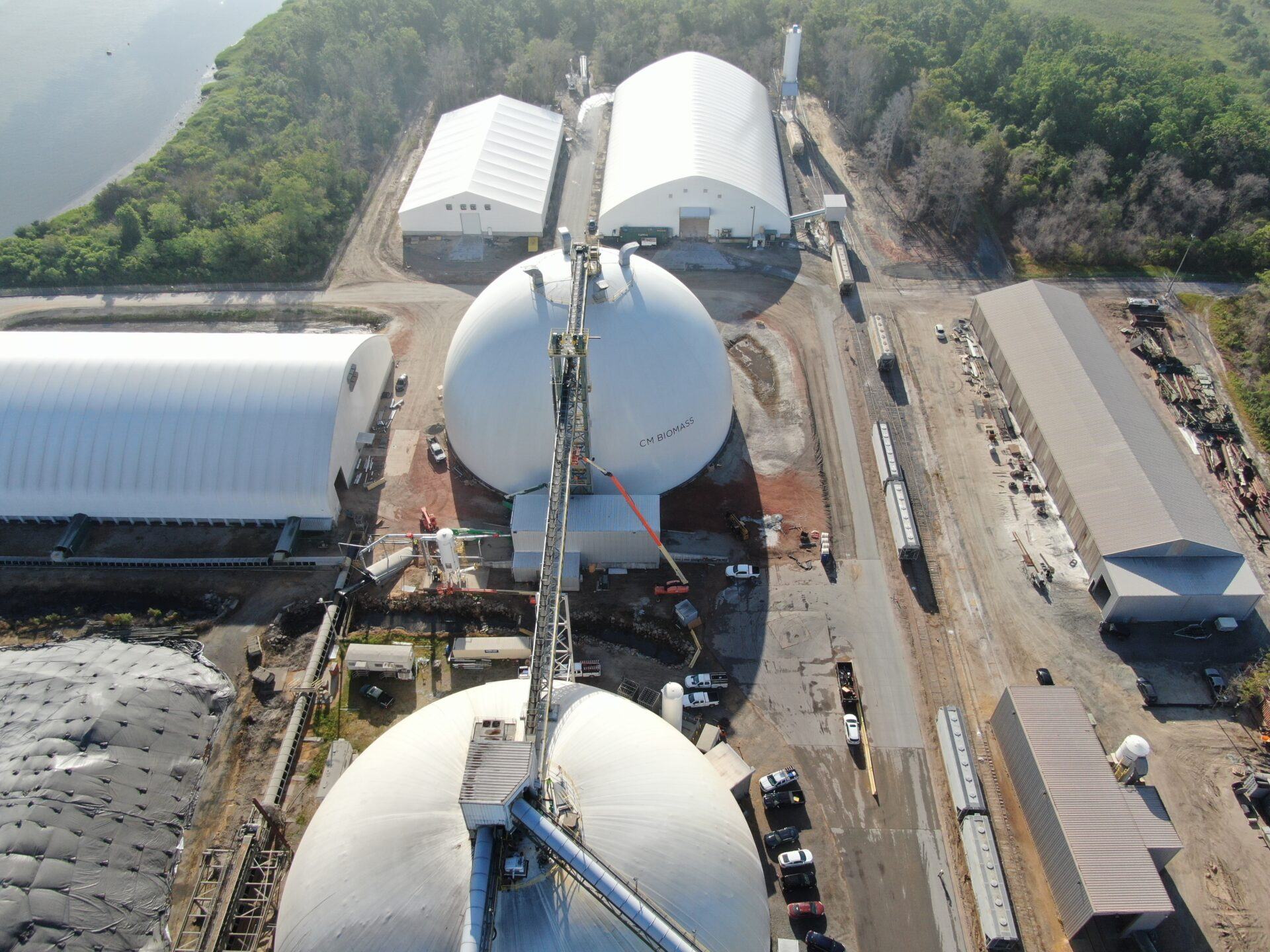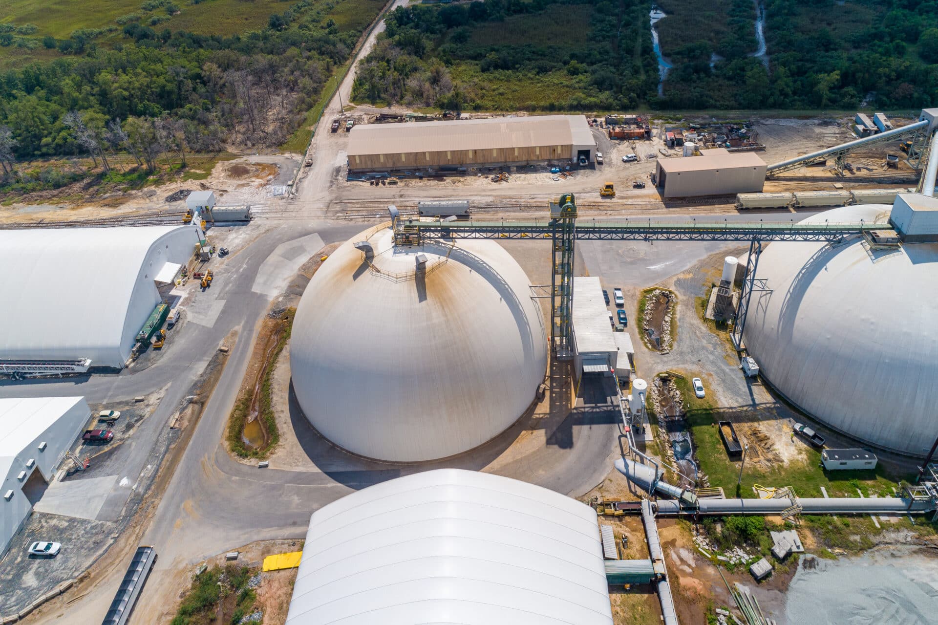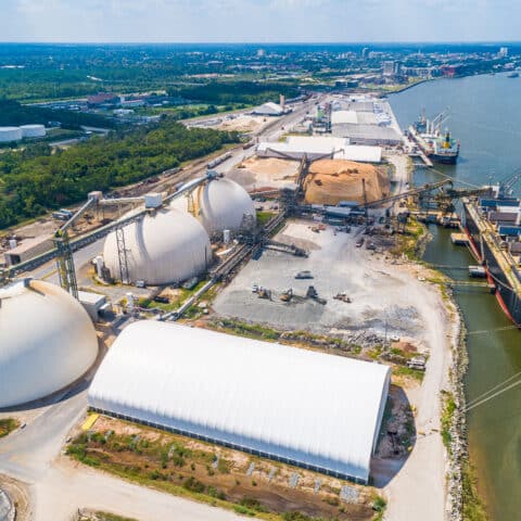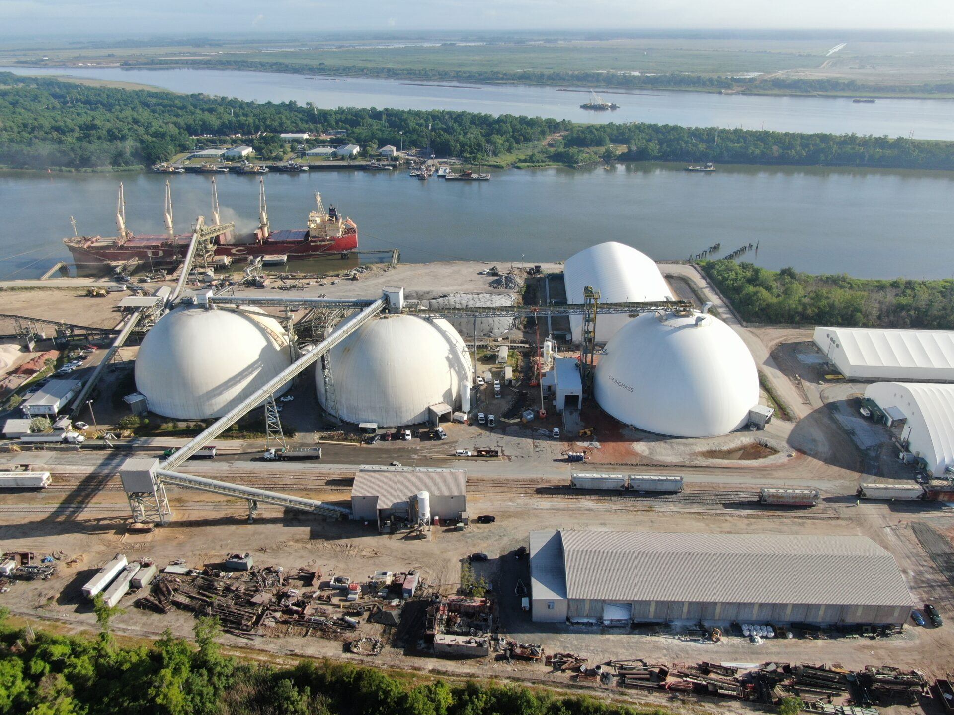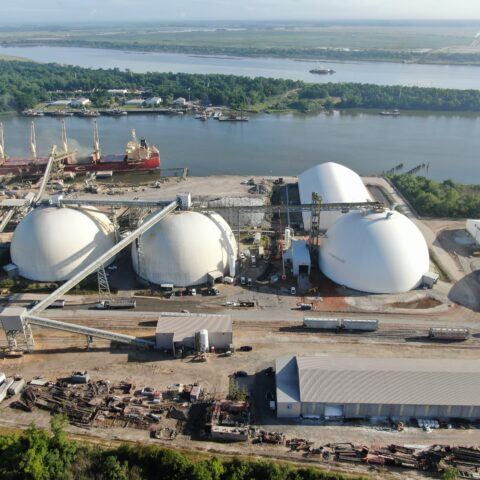 Dome 3 stores 30,000 metric tons and is 190 feet in diameter and 105.5 feet tall. Live reclaim moves product to a tunnel beneath the dome, and front-end loader cleans up the remainder. The previous two domes store 25,000 metric tons apiece and were designed to be filled by train. With the third dome, trains still deliver product, but truck reception is now another option for the site. Pellets at all three domes are reclaimed by gravity feed to the ship loader.